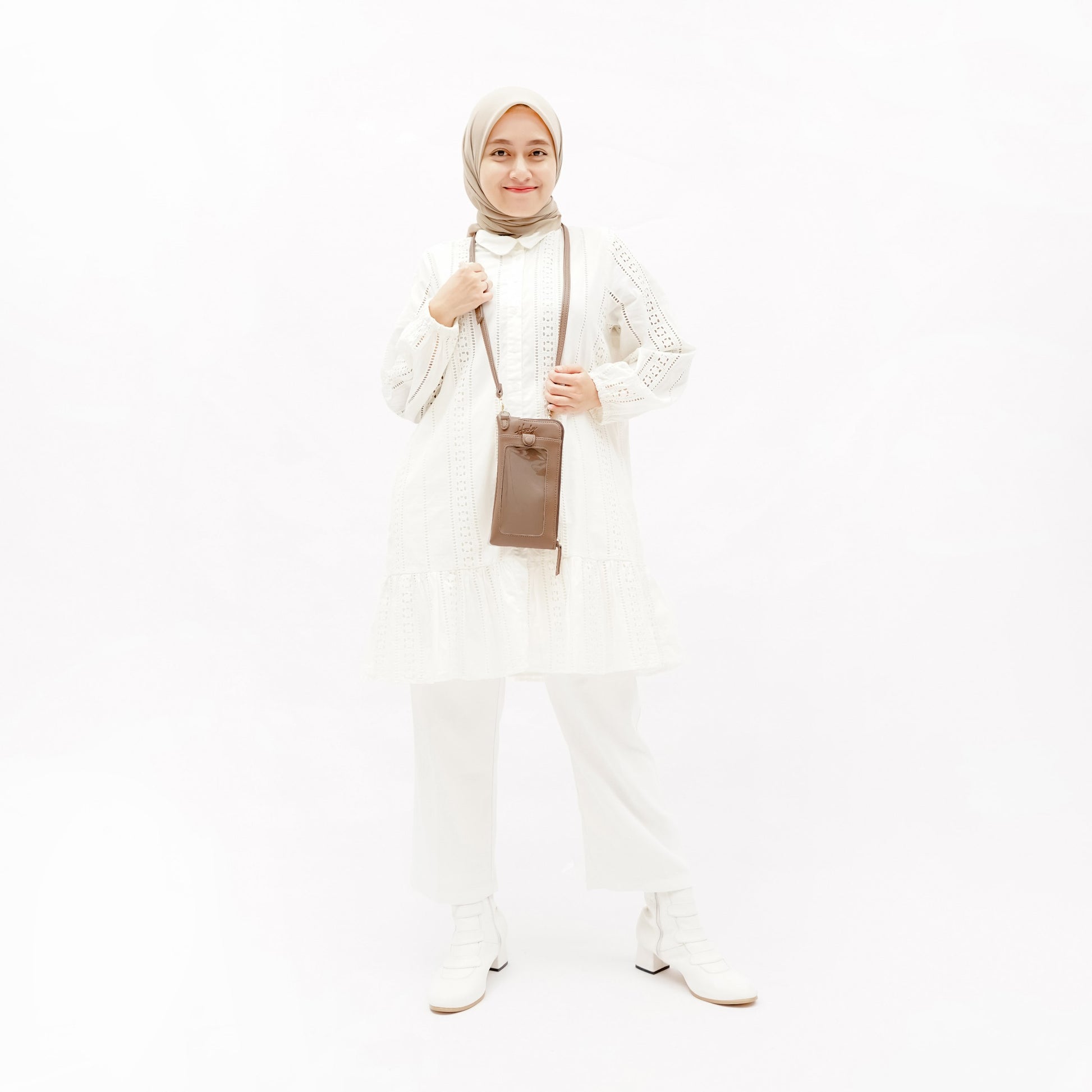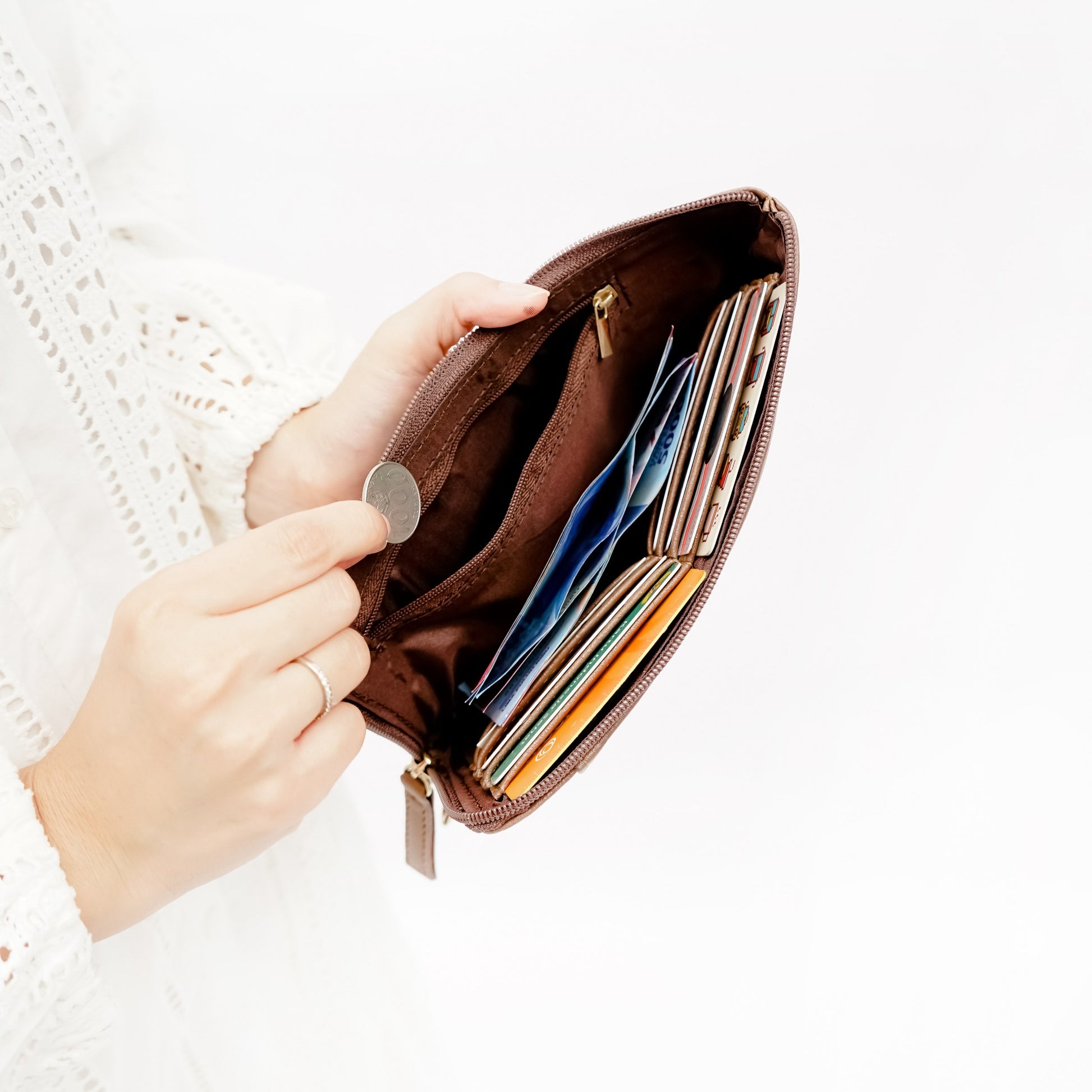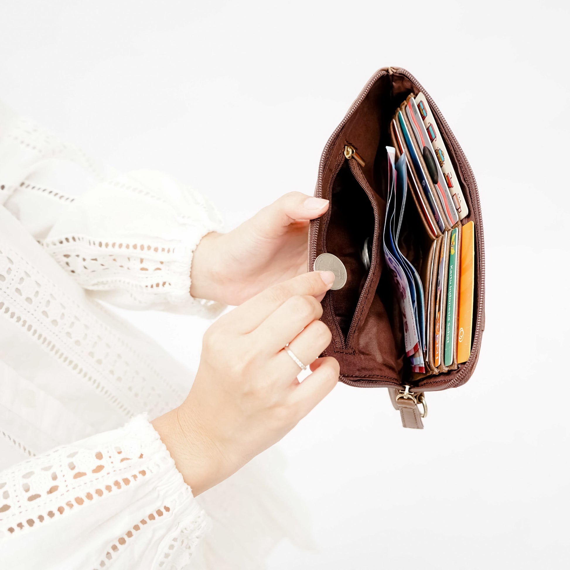 Terdapat satu pocket memakai resleting untuk menyimpan uang koin